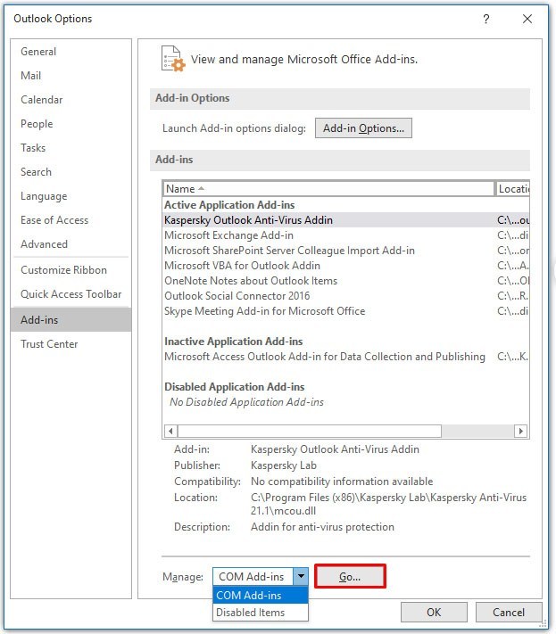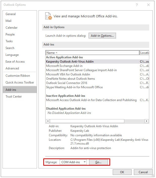 - 드롭 다운 메뉴에서 COM 추가 기능을 클릭합니다.