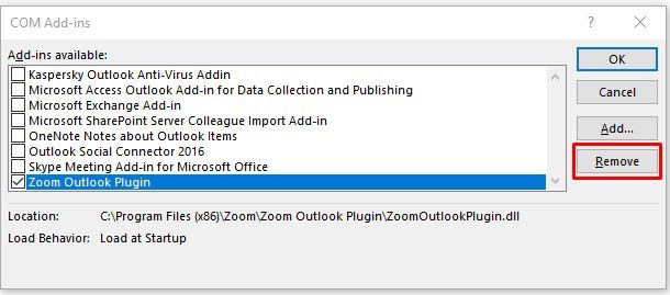 - COM 추가 기능 창에서 Zoom Outlook Plugin을 제외한 모든 확인란을 선택 취소 합니다. 계속하기 전에 다른 플러그인에 체크 표시가 없는지 확인하십시오.
