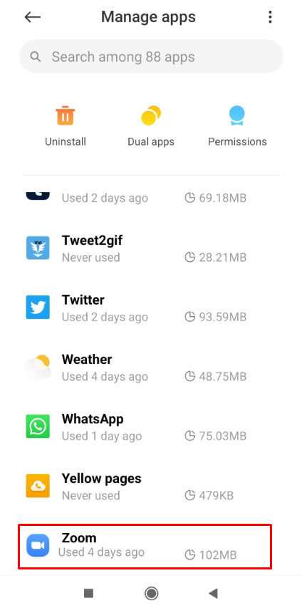 - 표시되는 애플리케이션 목록에서 Zoom을 찾을 때까지 아래로 스크롤합니다.