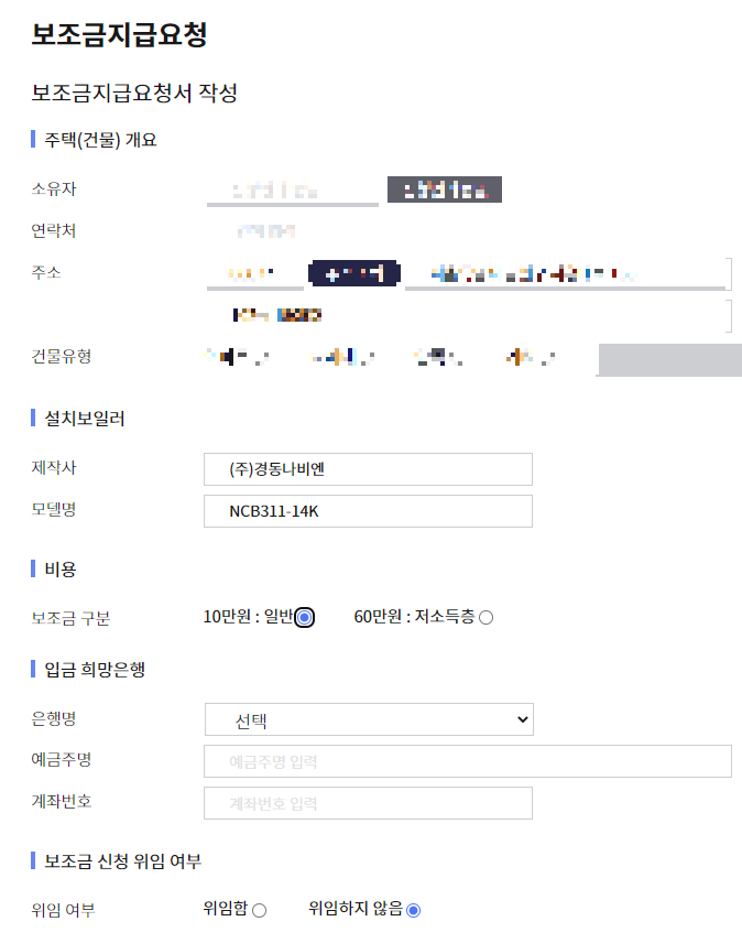 6. 보조금 지급 요청도 개인정보 입력 해주세요 보조금 구분은 저소득층 아니시라면 10만원 체크 해주세요