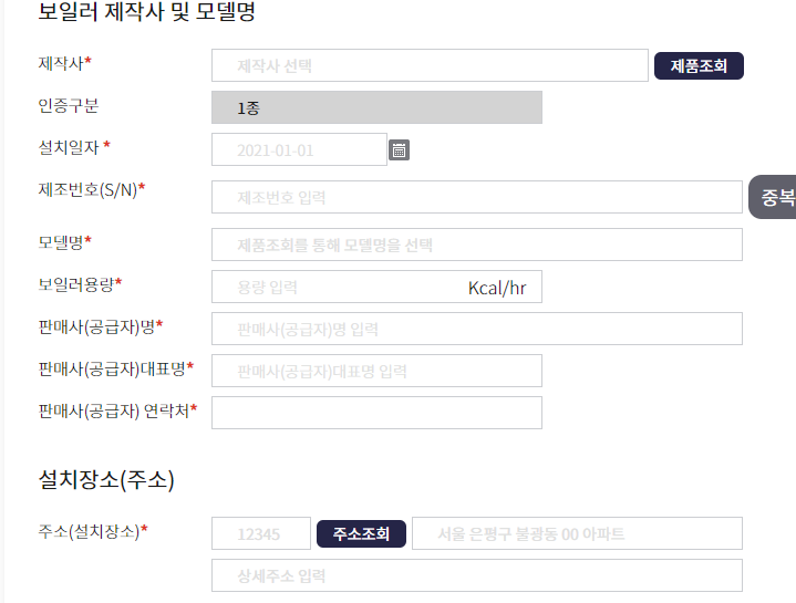 보일러 선택 후 해당 지역 제품 S/N 설치 일자 모델명 공급자 대표자등 정보 입력해주세요