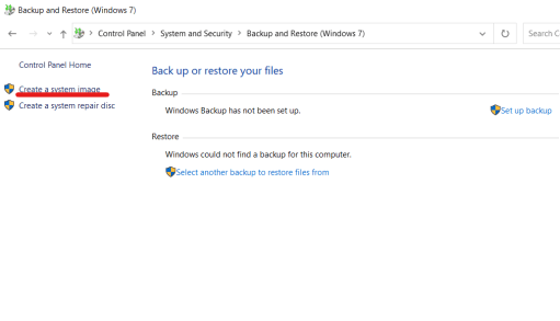 - 다음 단계는 현재 컴퓨터의 시스템 이미지를 만드는 것입니다. 이 작업은 제어판 으로 이동하여 백업 및 복원 을 선택한 다음 시스템 이미지 만들기 를 선택하여 수행할 수 있습니다 .